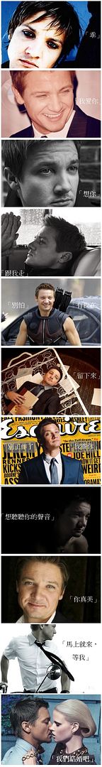 2012-08-31 • Jeremy Renner [我流改圖] 對哪句話最沒抵抗力? 最近看到這個題目:對哪句話最沒抵抗力? 1.乖 2.我愛你 3.想你 4.跟我走 5.別怕有我在 6.留下來7.別工作了我養你 8.想聽聽你的聲音 9.你真美 10.馬上就來等我 11.我們結婚吧 剛開始對這些選項很無感,直到看見有人搭配圖片突然間…這些選項就變得好誘人哦!所以,我作了雷納先生版!圖片下收: 老闆,套餐一份,謝謝! 相關